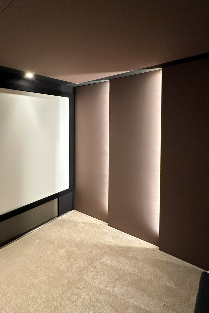 Die besondere Herausforderung bei diesem Vorhaben: Die Realisierung eines hochwertigen Kinos in einem Kellerraum, der sich nicht im Wohneigentum befindet, sondern nur gemietet ist – eine Tatsache, die bei Projekten dieser Größenordnung eher untypisch ist und einen besonders durchdachten, reversiblen Ausbau erforderte.